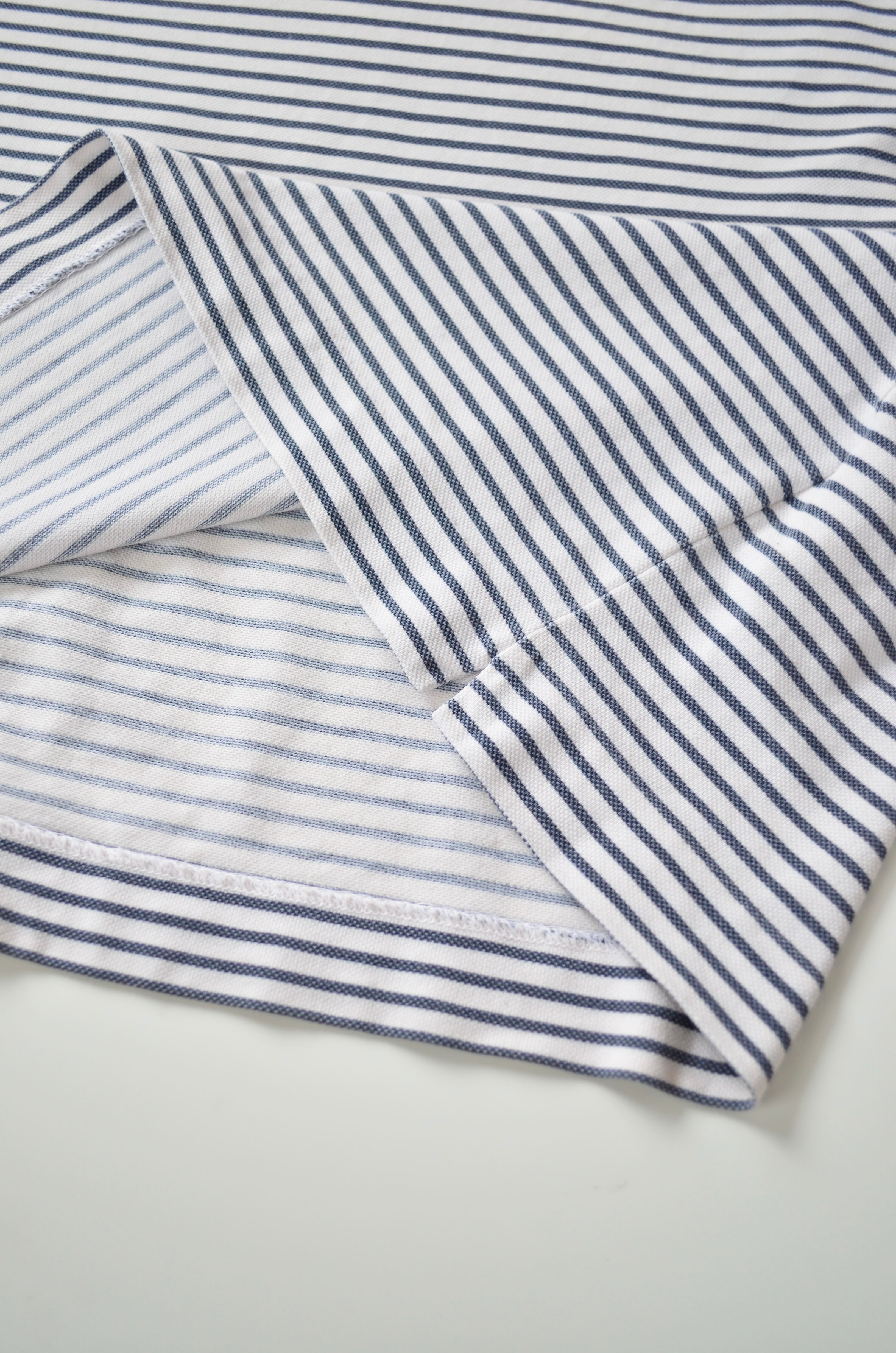 ホワイトをベースに細かなネイビーストライプを配した、ミリタリーとマリンを融合させたようなデザインが特徴的。