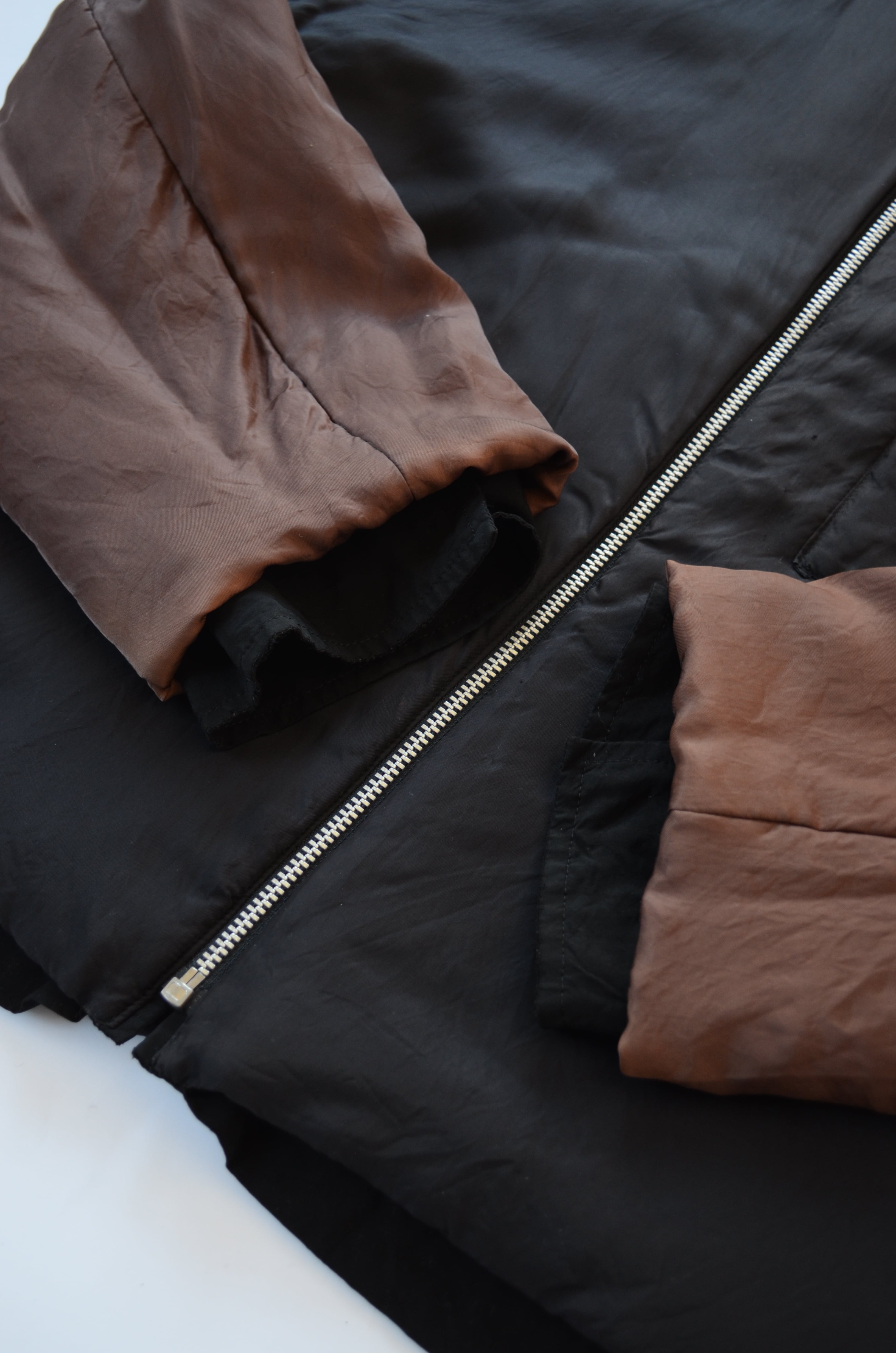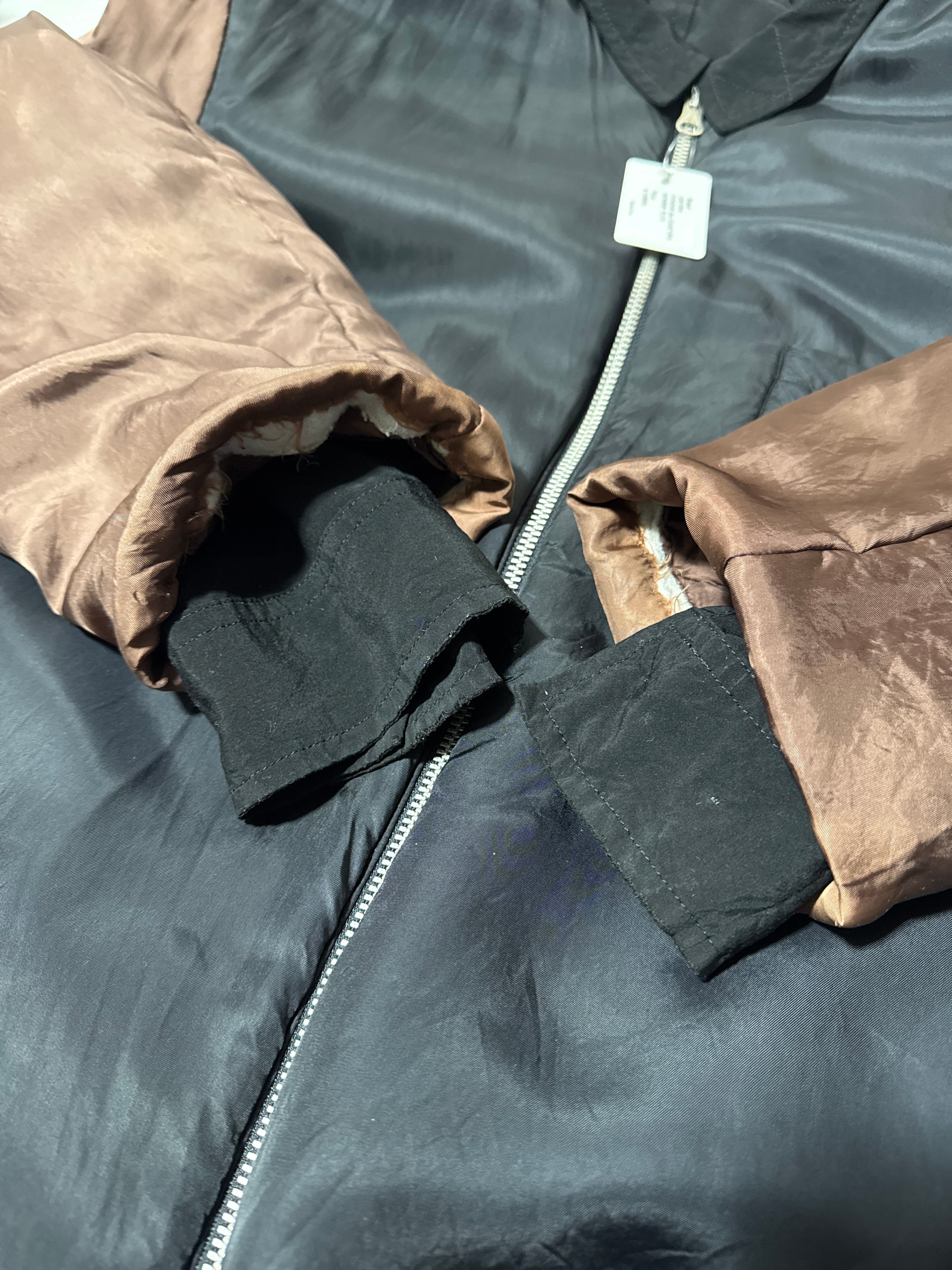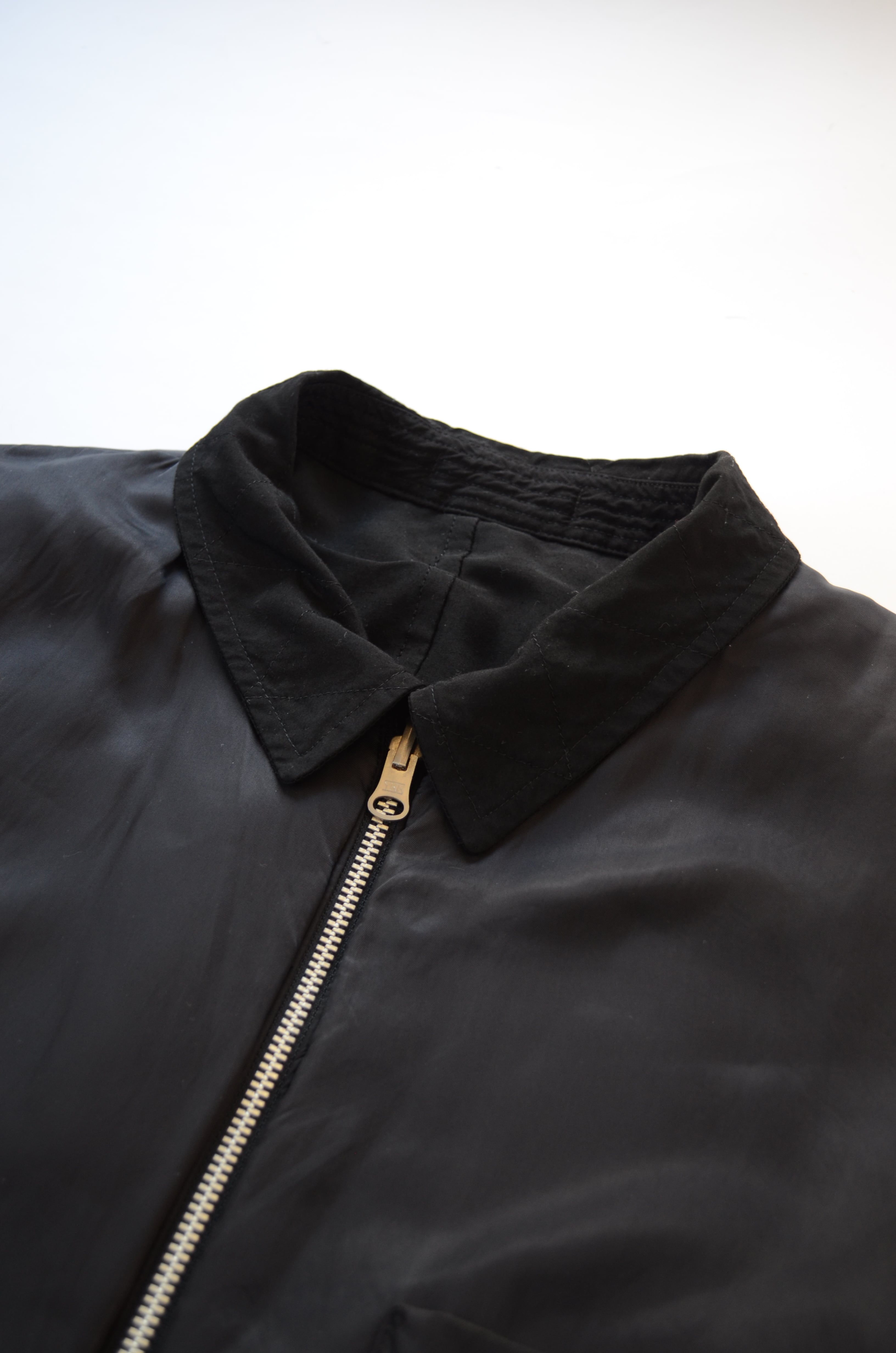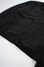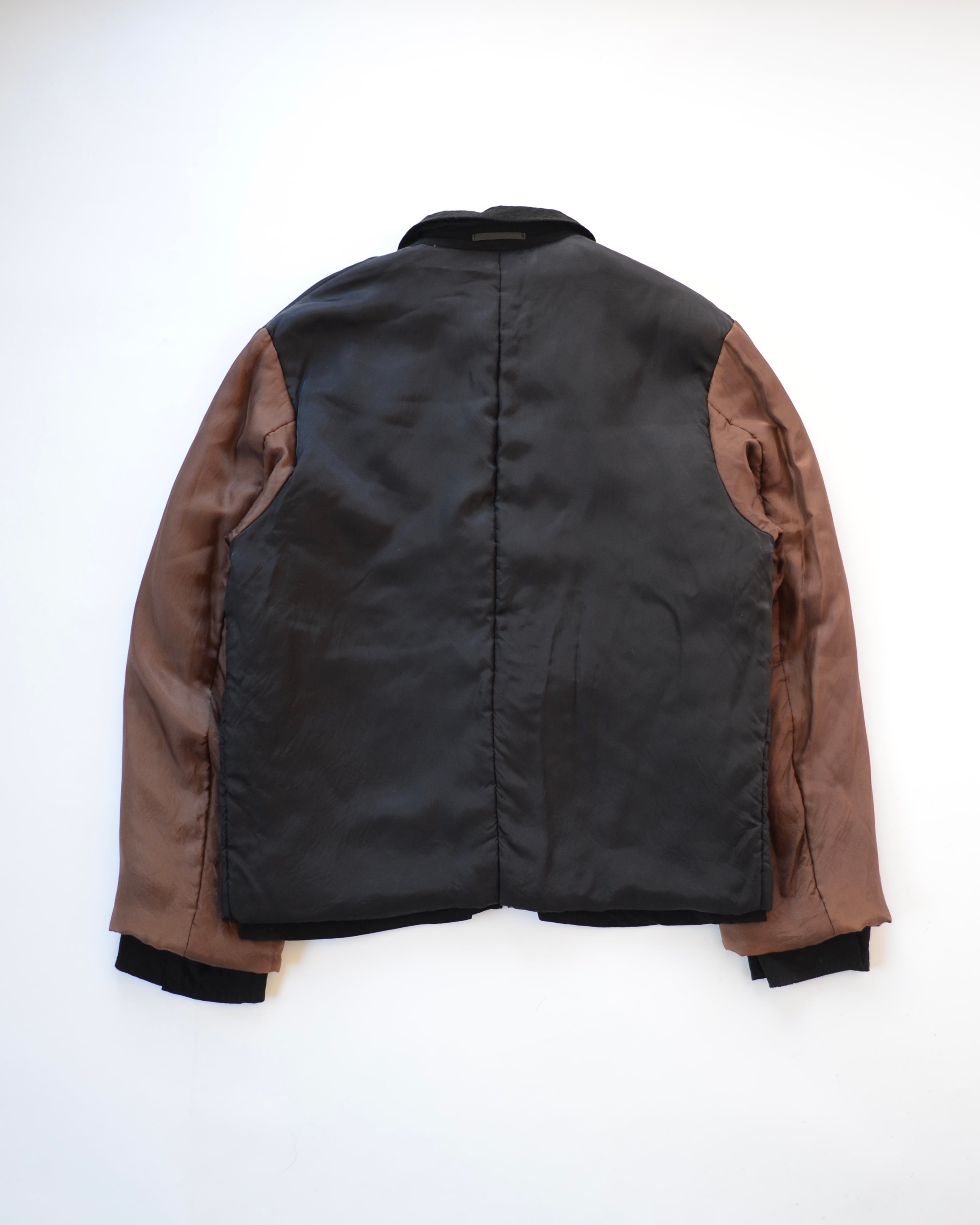 このアイテムは縮絨ではないものの、袖切替中綿入りのレーヨン生地をあえて表面に晒した"ユーモア"あふれる仕様。